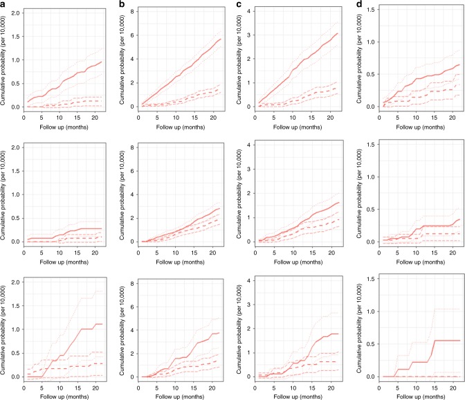 Results: Women with a lump had a threefold (hazard ratio 3.7, 95% confidence interval (CI) 3.0-4.6) risk of ICs and a higher risk (hazard ratio 1.7, 95% CI 1.4 to 2.0) at the subsequent visit compared with those without a lump. The fatal interval cancer risk increased by 0.39 per 1000 screens with a lump. The cumulative incidences of interval cancer increased within a month of a mammography-negative visit with a lump and after about 6 months of the visit with retraction or nipple discharge.