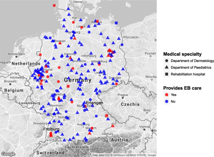 Background: Rare diseases affect approximately 30 million people in the European Union and present a major health issue. Over 1000 rare skin diseases are known, many of which are of genetic origin and manifest in childhood. One of these diseases is epidermolysis bullosa (EB), a genodermatosis presenting with skin fragility and blistering. With an estimate of up to 2000 affected individuals in Germany, many of these children, but only two specialist centres, the question arose where and how health care for this rare disease is provided. This question was addressed by an online survey of all paediatric and dermatological departments in Germany.