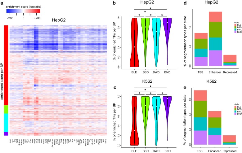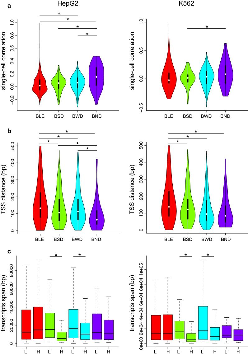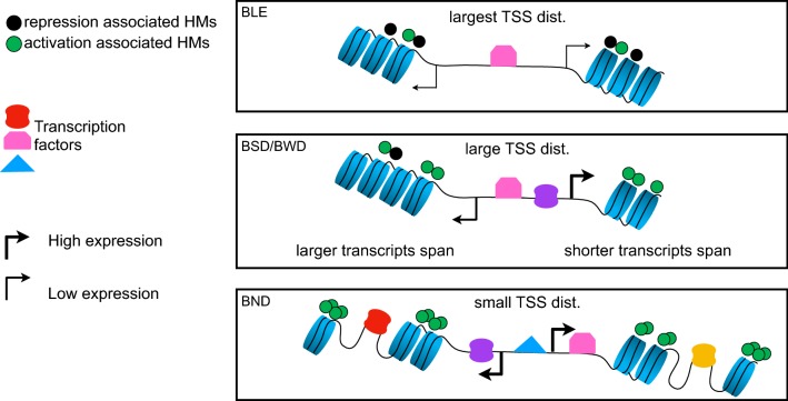 Results: We performed integrative analyses of novel human single-cell RNA-seq (scRNA-seq) data with bulk ChIP-seq and other epigenetics data. scRNA-seq data revealed distinct transcription states of BPs that were previously not recognized. We find associations between these transcription states to distinct patterns in structural gene features, DNA accessibility, histone modification, DNA methylation and TF binding profiles.