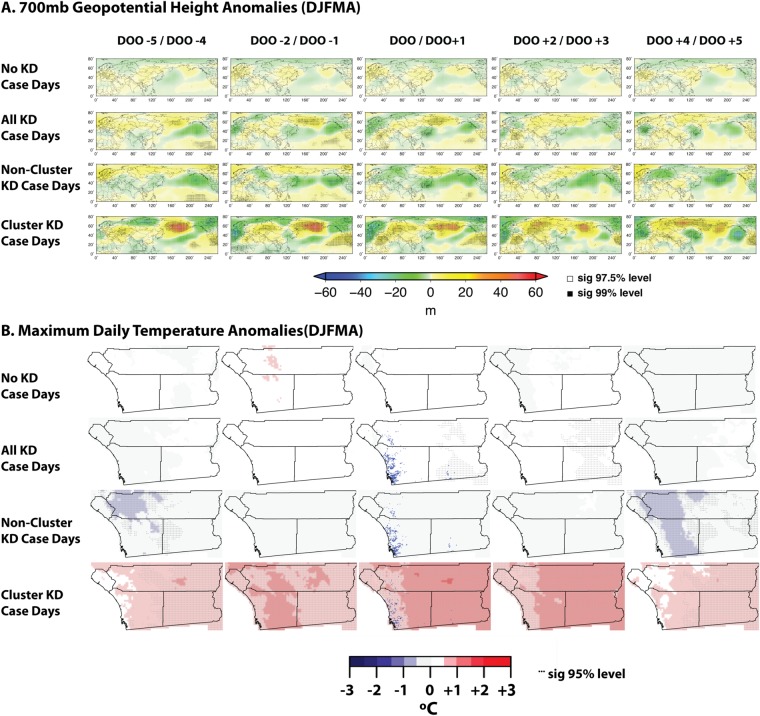 Kawasaki Disease (KD) is the most common cause of pediatric acquired heart disease, but its etiology remains unknown. We examined 1164 cases of KD treated at a regional children's hospital in San Diego over a period of 15 years and uncovered novel structure to disease incidence. KD cases showed a well-defined seasonal variability, but also clustered temporally at much shorter time scales (days to weeks), and spatiotemporally on time scales of up to 10 days and spatial scales of 10-100 km. Temporal clusters of KD cases were associated with strongly significant regional-scale air temperature anomalies and consistent larger-scale atmospheric circulation patterns. Gene expression analysis further revealed a natural partitioning of KD patients into distinct groups based on their gene expression pattern, and that the different groups were associated with certain clinical characteristics that also exhibit temporal autocorrelation. Our data suggest that one or more environmental triggers exist, and that episodic exposures are modulated at least in part by regional weather conditions. We propose that characterization of the environmental factors that trigger KD in genetically susceptible children should focus on aerosols inhaled by patients who share common disease characteristics.