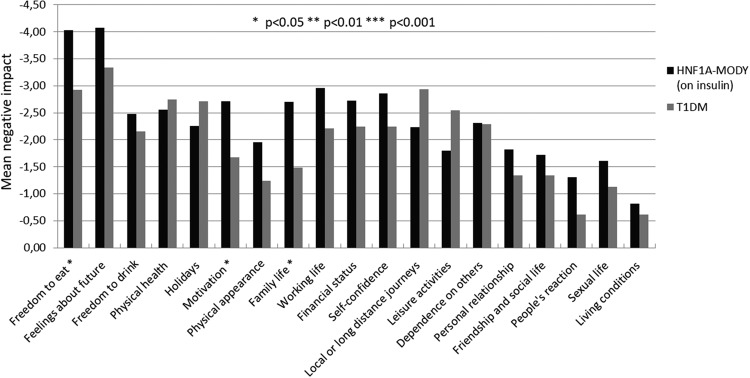 Methods: The study included 80 patients with HNF1A-MODY and 89 GCK gene mutation carriers. We also examined 128 type 1 diabetes (T1DM) patients for comparison. Diabetes-specific QoL was assessed using the Audit of Diabetes Dependent Quality of Life questionnaire.