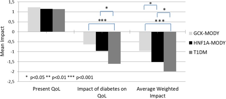 Conclusion: MODY has a smaller negative impact on QoL compared to T1DM. Mode of treatment further stratifies QoL decline for HNF1A-MODY subjects.