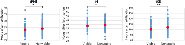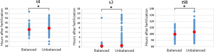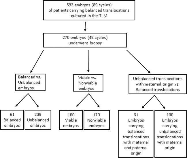 Results: The PGD analysis found that 209 (77%) of the 270 biopsied embryos carried an unbalanced translocation. Embryos carrying unbalanced translocations, which are expected to lead to implantation failure or miscarriage, cleaved less synchronously and were delayed in time of cleavage to the 4-cell stage (t4) and in time of start of blastulation (tSB) compared with balanced embryos (P < 0.05). Furthermore, embryos carrying nonviable translocations demonstrated a significant delay at the time of pronuclei fading (tPNf) compared with those carrying potentially viable translocations (P < 0.05). Embryos whose unbalanced translocations were of maternal origin were significantly delayed in most of the morphokinetic parameters (including tPNf, t2, t3, t4, t6, t7, t8, cc2, s2, and tSB) compared with embryos carrying balanced translocations (P < 0.05).