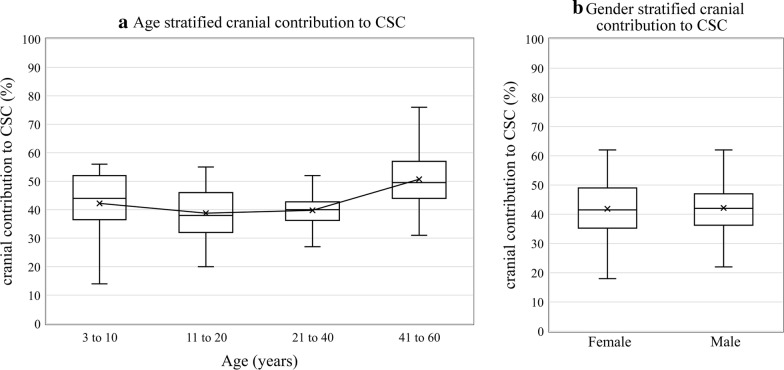 Results: A significant negative correlation was found between model-predicted cranial contribution to CSC and MR-ICP. The spinal canal provided majority of the compliance in all the age groups up to 40 years. However, no single sub-compartment provided majority of the compliance in 41-60 years age group. The cranial contribution to CSC and MR-ICP were significantly correlated with age, with gender not affecting the compliance distribution. Spinal contribution to CSC significantly positively correlated with CSF stroke volume.