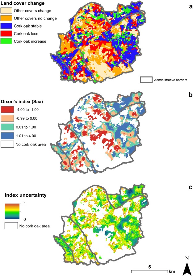 Land cover change analyses are common and, especially in the absence of explanatory variables, they are mainly carried out by employing qualitative methods such as transition matrices or raster operations. These methods do not provide any estimation of the statistical significance of the changes, or the uncertainty of the model and data, and are usually limited in supporting explicit biological/ecological interpretation of the processes determining the changes. Here we show how the original nearest-neighbour contingency table, proposed by Dixon to evaluate spatial segregation, has been extended to the temporal domain to map the intensity, statistical significance and uncertainty of land cover changes. This index was then employed to quantify the changes in cork oak forest cover between 1998 and 2016 in the Sa Serra region of Sardinia (Italy). The method showed that most statistically significant cork oak losses were concentrated in the centre of Sa Serra and characterised by high intensity. A spatial binomial-logit generalised linear model estimated the probability of changes occurring in the area but not the type of change. We show how the spatio-temporal Dixon's index can be an attractive alternative to other land cover change analysis methods, since it provides a robust statistical framework and facilitates direct biological/ecological interpretation.