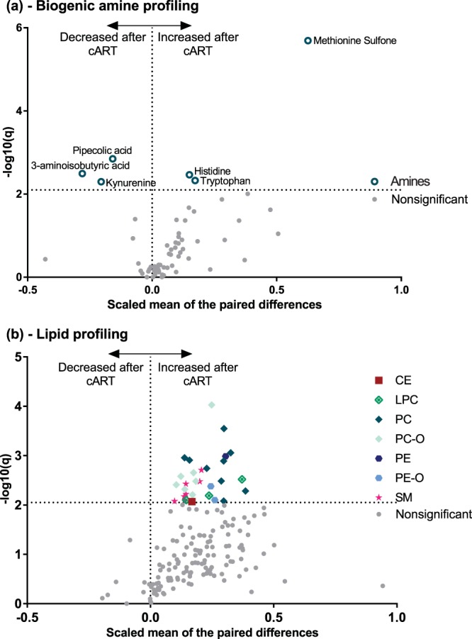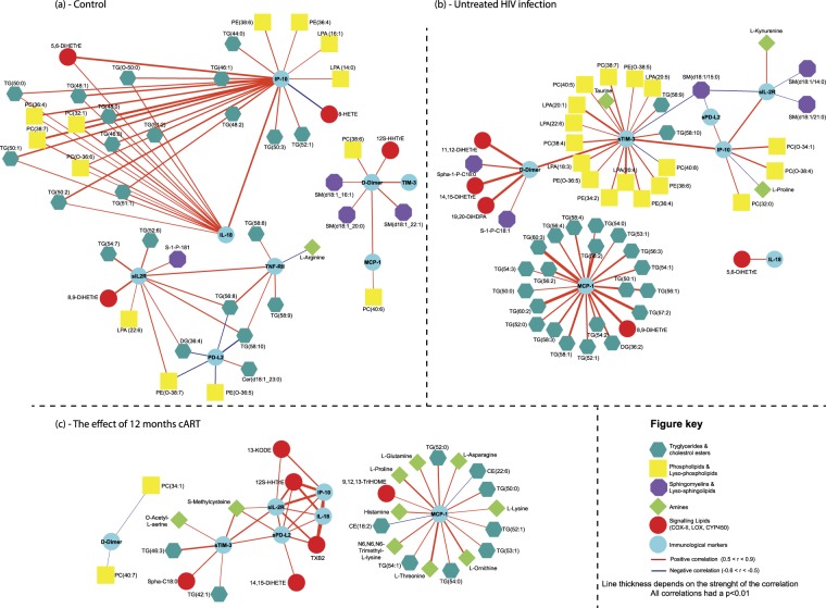 The HIV-human metabolic relationship is a complex interaction convoluted even more by antiretroviral therapy (cART) and comorbidities. The ability of cART to undo the HIV induced metabolic dysregulation is unclear and under-investigated. Using targeted metabolomics and multiplex immune biomarker analysis, we characterized plasma samples obtained from 18 untreated HIV-1-infected adult patients and compared these to a non-HIV infected (n = 23) control population. The biogenic amine perturbations during an untreated HIV infection implicated altered tryptophan- nitrogen- and muscle metabolism. Furthermore, the lipid profiles of untreated patients were also significantly altered compared to controls. In untreated HIV infection, the sphingomyelins and phospholipids correlated negatively to markers of infection IP-10 and sIL-2R whereas a strong association was found between triglycerides and MCP-1. In a second cohort, we characterized plasma samples obtained from 28 HIV-1-infected adult patients before and 12 months after the start of cART, to investigate the immune-metabolic changes associated with cART. The identified altered immune-metabolic pathways of an untreated HIV infection showed minimal change after 12 months of cART. In conclusion, 12 months of cART impacts only mildly on the metabolic dysregulation underlying an untreated HIV infection and provide insights into the comorbidities present in virally suppressed HIV patients.