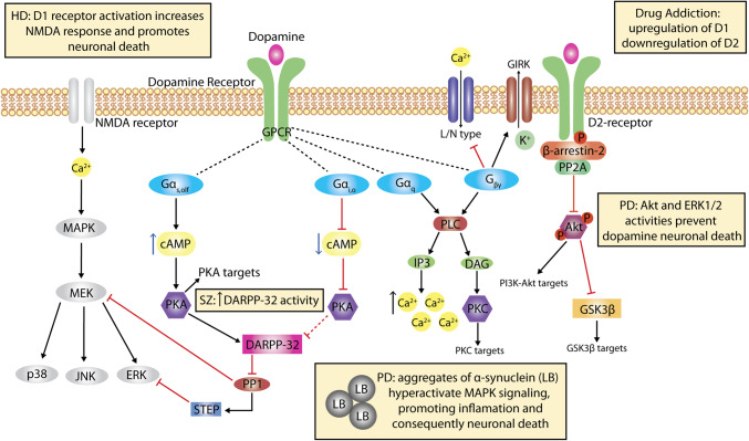The dopaminergic system plays important roles in neuromodulation, such as motor control, motivation, reward, cognitive function, maternal, and reproductive behaviors. Dopamine is a neurotransmitter, synthesized in both central nervous system and the periphery, that exerts its actions upon binding to G protein-coupled receptors. Dopamine receptors are widely expressed in the body and function in both the peripheral and the central nervous systems. Dopaminergic signaling pathways are crucial to the maintenance of physiological processes and an unbalanced activity may lead to dysfunctions that are related to neurodegenerative diseases. Unveiling the neurobiology and the molecular mechanisms that underlie these illnesses may contribute to the development of new therapies that could promote a better quality of life for patients worldwide. In this review, we summarize the aspects of dopamine as a catecholaminergic neurotransmitter and discuss dopamine signaling pathways elicited through dopamine receptor activation in normal brain function. Furthermore, we describe the potential involvement of these signaling pathways in evoking the onset and progression of some diseases in the nervous system, such as Parkinson's, Schizophrenia, Huntington's, Attention Deficit and Hyperactivity Disorder, and Addiction. A brief description of new dopaminergic drugs recently approved and under development treatments for these ailments is also provided.