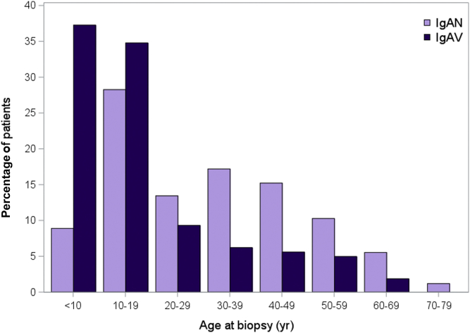 Results: A total of 667 patients (506 IgAN, 161 IgAV) constitute the IgAN/IgAV cohort (382 adults, 285 children). At biopsy, those with IgAV were younger (13.0 years vs. 29.6 years, P < 0.001), more frequently white (89.7% vs. 78.9%, P = 0.003), had a higher estimated glomerular filtration rate (103.5 vs. 70.6 ml/min per 1.73 m2, P < 0.001), and lower serum albumin (3.4 vs. 3.8 g/dl, P < 0.001) than those with IgAN. Adult and pediatric individuals with IgAV were more likely than those with IgAN to have been treated with immunosuppressive therapy at or prior to enrollment (79.5% vs. 54.0%, P < 0.001).