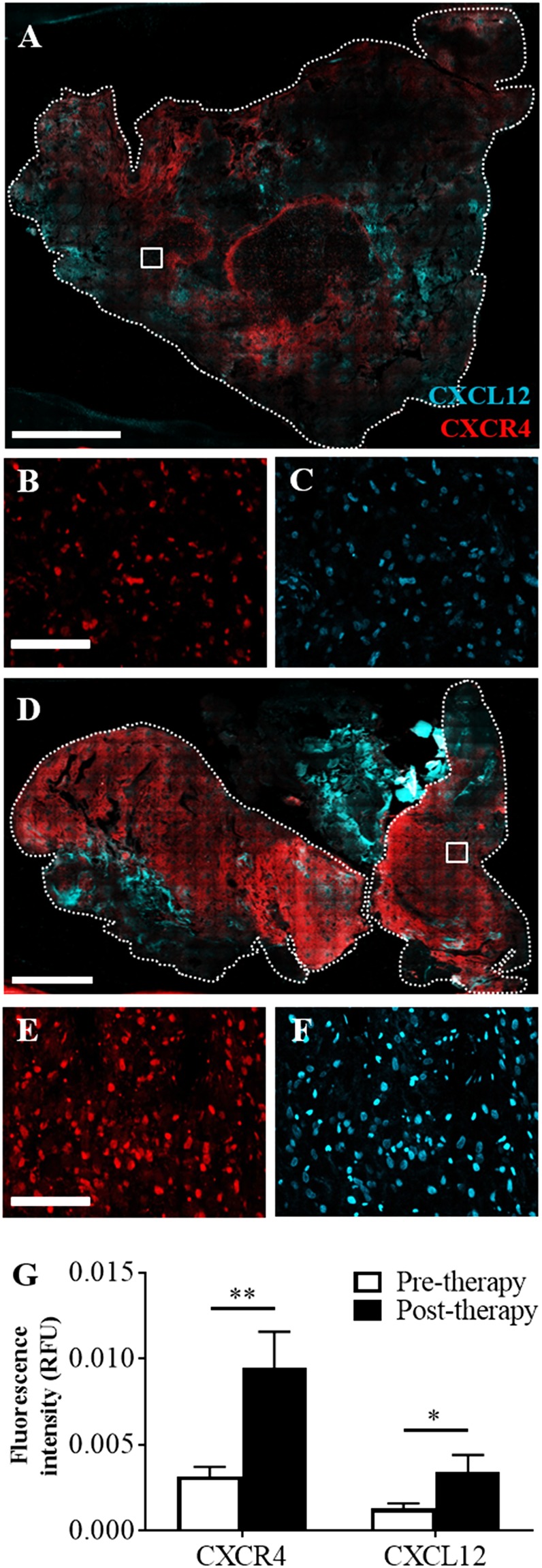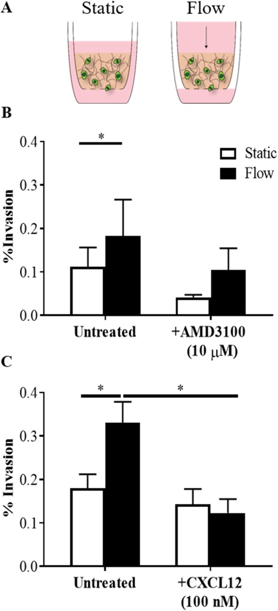 Glioblastoma is the most common and malignant form of brain cancer. Its invasive nature limits treatment efficacy and promotes inevitable recurrence. Previous in vitro studies showed that interstitial fluid flow, a factor characteristically increased in cancer, increases glioma cell invasion through CXCR4-CXCL12 signaling. It is currently unknown if these effects translate in vivo. We used the therapeutic technique of convection enhanced delivery (CED) to test if convective flow alters glioma invasion in a syngeneic GL261 mouse model of glioblastoma. The GL261 cell line was flow responsive in vitro, dependent upon CXCR4 and CXCL12. Additionally, transplanting GL261 intracranially increased the populations of CXCR4+ and double positive cells versus 3D culture. We showed that inducing convective flow within implanted tumors indeed increased invasion over untreated controls, and administering the CXCR4 antagonist AMD3100 (5 mg/kg) effectively eliminated this response. These data confirm that glioma invasion is stimulated by convective flow in vivo and depends on CXCR4 signaling. We also showed that expression of CXCR4 and CXCL12 is increased in patients having received standard therapy, when CED might be elected. Hence, targeting flow-stimulated invasion may prove beneficial as a second line of therapy, particularly in patients chosen to receive treatment by convection enhanced delivery.