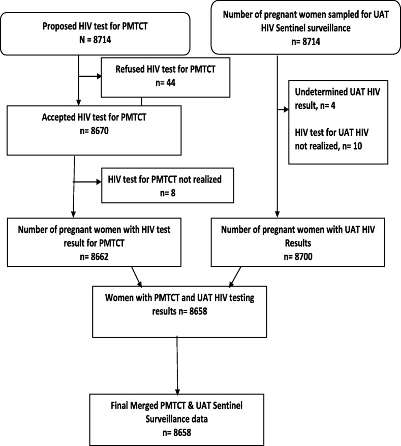 Results: The median site HIV prevalence using routine PMTCT HIV testing data was 1.1% (IQR: 1.0) while the median site prevalence from the UAT HIV Sentinel Surveillance data was at 1.0% (IQR: 1.6). The Positive per cent agreement (PPA) of the PMTCT HIV test results compared to those of the Sentinel Surveillance was 85.1% (95% CI 77.2-90.7%), and the percent-negative agreement (PNA) was 99.9% (95% CI 99.8-99.9%). The overall HIV prevalence according to UAT was the same as that found for women accepting a PMTCT HIV test and those who refused, with percent bias at 0.00%. For several key PMTCT variables, including "HIV test offered" (85.2%), "HIV test acceptance" (78.0%), or "HIV test done" (58.8%), the proportion of records in registers with combined complete and valid data was below the WHO benchmark of 90%.
