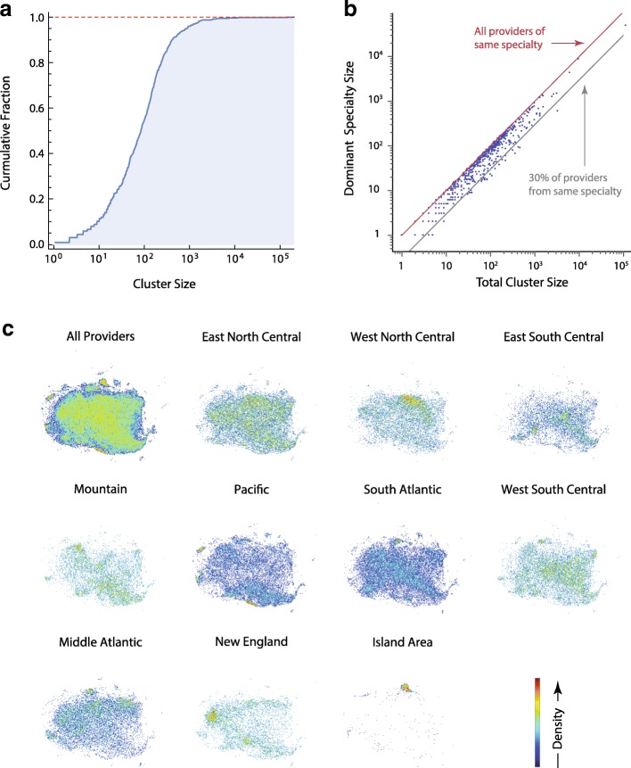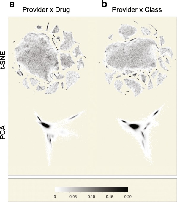 Conclusions: This work demonstrates that unsupervised clustering, dimension-reduction and t-SNE visualization can be used to analyze and visualize variation in provider prescribing patterns on a national level across thousands of medications, revealing substantial prescribing variation both between and within specialties, regionally, and between major metropolitan areas. These methods offer an alternative system-wide and pattern-centric view of such data for hypothesis generation, visualization, and pattern identification.