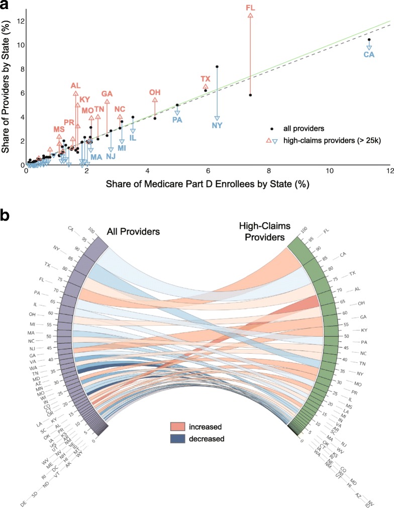 Results: Distributions of prescribing volume and medication diversity were highly skewed among over 800,000 Medicare Part D providers. Medical specialties had characteristic prescribing patterns. Although the number of Medicare providers in each state was highly correlated with the number of Medicare Part D enrollees, some states were enriched for providers with > 10,000 prescription claims annually. Dimension-reduction, hierarchical clustering and t-SNE visualization of drug- or drug-class prescribing patterns revealed that providers cluster strongly based on specialty and sub-specialty, with large regional variations in prescribing patterns. Major metropolitan areas had distinct prescribing patterns that tended to group by major geographical divisions.