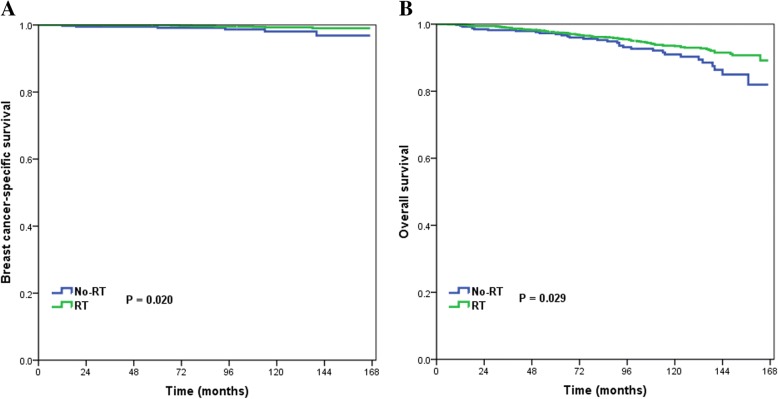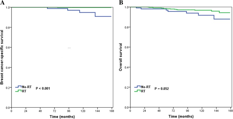 Results: Data from 2442 patients were analyzed, of whom 2020 (82.7%) received postoperative radiotherapy and 422 (17.3%) did not. The number of patients treated with or without postoperative radiotherapy showed no differences during the study period (p = 0.184). Radiotherapy was more likely to be administered in patients with well differentiated tumors. Multivariate Cox analysis showed that postoperative radiotherapy delivery was significantly correlated with better breast cancer-specific survival (BCSS) (hazard ratio [HR] 0.297, 95% confidence interval [CI] 0.105-0.836, p = 0.022) and overall survival (OS) (HR 0.656, 95% CI 0.441-0.978, p = 0.038). Ten 10-year BCSS was 99.3% in patients who received postoperative radiotherapy and 98.1% in those who did not (p = 0.020), and 10-year OS was 93.4 and 91.0%, respectively (p = 0.029). Postoperative radiotherapy increased BCSS and OS in the subgroups of age < 50 years, non-Hispanic white, well differentiated tumors, and progesterone receptor positive tumors.