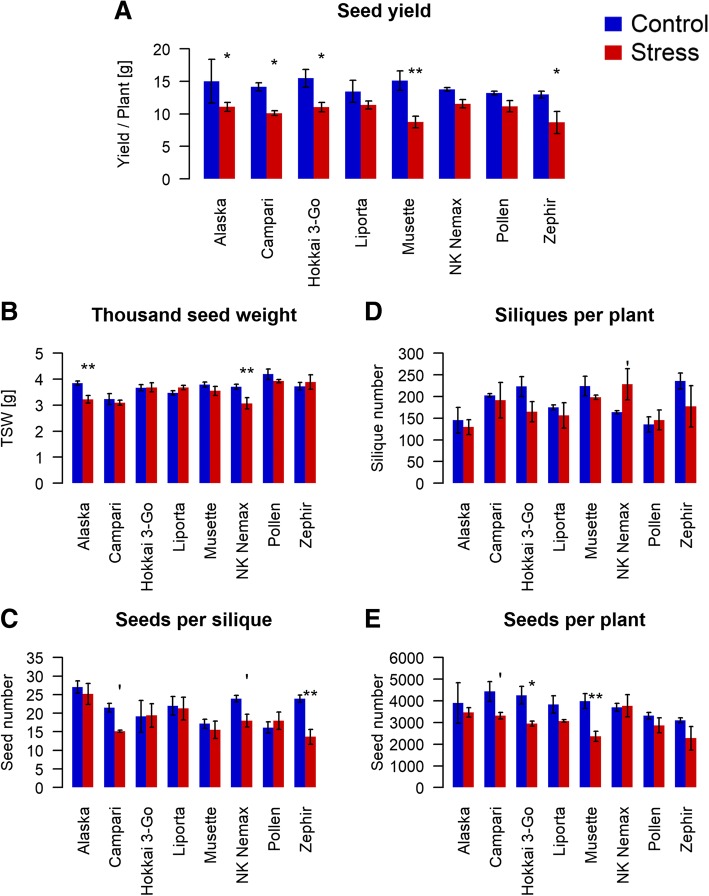 Background: Drought stress has a negative effect on both seed yield and seed quality in Brassica napus (oilseed rape, canola). Here we show that while drought impairs the maternal plant performance, it also increases the vigour of progeny of stressed maternal plants. We investigated the transgenerational influence of abiotic stress by detailed analysis of yield, seed quality, and seedling performance on a growth-related and metabolic level. Seeds of eight diverse winter oilseed rape genotypes were generated under well-watered and drought stress conditions under controlled-environment conditions in large plant containers.
