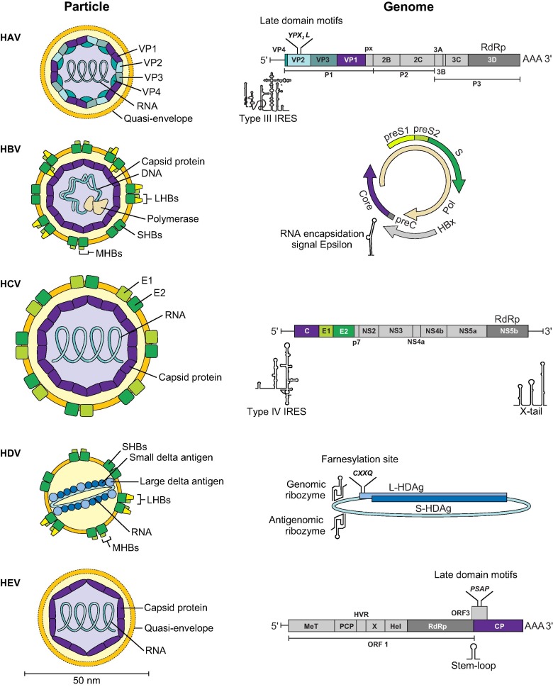 Hepatitis virus homologues in non-human hosts. (A) Simplified phylogenetic tree of mammalian orders, Aves, Reptilia, Amphibia, Osteichthyes, Condrichthyes, and Insecta (Phylogeny adapted from[196], [239]). Squares indicate orders for which homologues of human hepatitis viruses were found; black, same virus genus as human representative; grey, viruses distantly related to human hepatitis viruses. Host taxa for which no homologous hepatitis viruses were found are shown without pictograms and are coloured in grey. Numbers next to nodes show approximate time of divergence in million years according to., (B) GenBank entries of human hepatitis viruses and their homologues per mammalian host order given in percent of all entries of the search term. Host orders with less than 0.1% of entries are summarised as others. Host orders with less than 0.5% of entries are magnified 10-fold to the right. GenBank search terms and final entries per mammalian host taxon were: for HAV (January 17, 2018): “Hepatovirus [Organism] AND host [All Fields]”, Human, n = 3,186, Rodentia, n = 90, Eulipotyphla, n = 49, Chiroptera, n = 32, NHP, n = 6, Scandentia, n = 1, and Carnivora, n = 1; for HBV (January 19, 2018): “Hepadnaviridae [Organism] AND host [All Fields]”, Human, n = 68,867, NHP, n = 156, Aves, n = 87, Chiroptera, n = 73, Rodents, n = 25 and Cetartiodactyla, n = 10; for HCV (January 18, 2018): “Hepacivirus [Organism] AND host [All Fields]”, Human, n = 132,645, NHP, n = 491, Perissodactyla, n = 456, Rodentia, n = 182, Carnivora, n = 25, Cetartiodactyla, n = 18 and Chiroptera, n = 12; for HDV (January 17, 2018): “Deltavirus [Organism] AND host [All Fields]”, Human, n = 912; for HEV (January 17, 2018): “Hepeviridae [Organism] AND host [All Fields]”, Human, n = 7,601, Cetartiodactyla, n = 3,152, Lagomorpha, n = 456, Rodentia, n = 316, Aves, n = 155, Carnivora, n = 76, Non-human primates, n = 16, Chiroptera, n = 10, Scandentia, n = 2, Eulipotyphla, n = 1 and Perissodactyla, n = 1. (C) Patristic distance (maximum percentage pairwise amino acid distance) per host order calculated in MEGA7 using translation alignments generated in Geneious 9.1.8. HAV: A GenBank search with the term “Hepatovirus” was performed on January 18, 2018, and all sequences longer than 6,000 nucleotides were selected. Duplicates, cell culture-adapted strains, or viruses isolated from experimentally infected animals were excluded from the dataset. Sorting according to host orders resulted in: Human, n = 101, NHP, n = 5, Chiroptera, n = 4, Rodentia, n = 7 and Eulipotyphla, n = 5 sequences for translation alignments of complete polyproteins. Non-homologous regions (px/3A) were subsequently deleted. For HBV, HCV and HDV, GenBank searches as performed for 3B were used. HBV: All sequences with complete polymerase CDS from non-human hosts were selected. Complete polymerase CDS of reference sequences from and the capuchin monkey hepatitis B virus (CMHBV, Acc. No. KY703886) were used. Sorting according to host orders resulted in Human, n = 37, NHP, n = 92, Chiroptera, n = 60 and Rodentia, n = 5 sequences. HCV: All sequences with complete polyprotein CDS from non-human hosts were selected. Complete polyprotein CDS of reference sequences from (https://hcv.lanl.gov/components/sequence/HCV/search/searchi.html) and GBV-B (Acc. No. NC001655) were used. Sorting according to host orders resulted in Human, n = 178, NHP, n = 4, Chiroptera, n = 5, Rodentia, n = 15, Perissodactyla, n = 19, Cetartiodactyla, n = 10 sequences. HDV: Sequences with complete HDAg CDS were selected resulting in a total of 158 human-derived sequences. HEV: A GenBank search with the term “Hepeviridae” was performed on January 25, 2018, and all sequences longer than 6,000 nucleotides were selected. Duplicates, cell culture-adapted strains, or viruses isolated from experimentally infected animals were excluded from the dataset. Sorting according to host orders resulted in Human, n = 165, Chiroptera, n = 3, Rodentia, n = 18, Cetartiodactyla, n = 93, Aves, n = 11, Carnivora, n = 13 and Lagomorpha, n = 17 sequences. CDS, coding sequences; HAV, hepatitis A virus; HBV, hepatitis B virus; HCV, hepatitis C virus; HDV, hepatitis delta virus; HEV, hepatitis E virus; NHP, non-human primates. Bars are coloured according to host taxon.