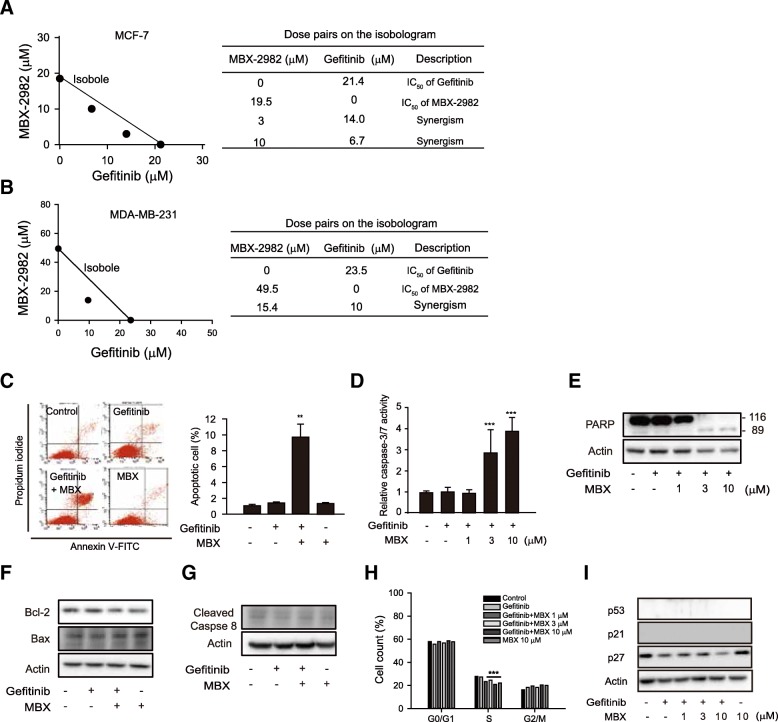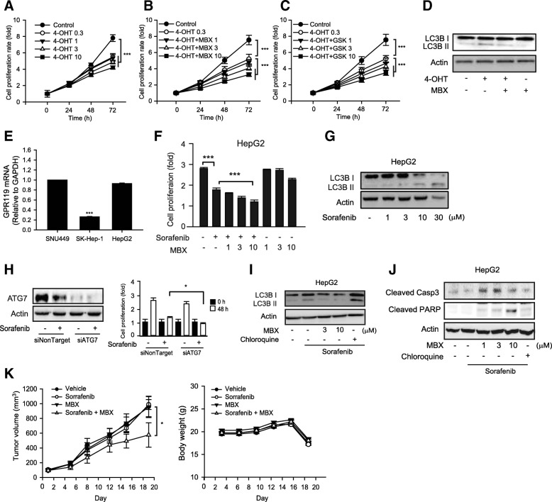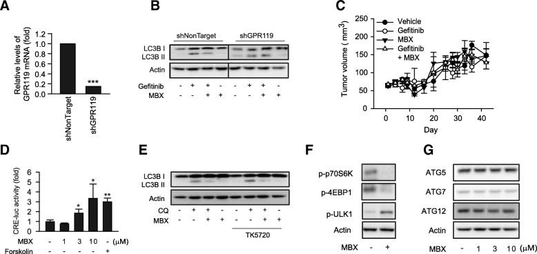Results: mRNA or protein expression of GPR119 was detected in 9 cancer cell lines and 19 tissue samples. Cotreatment with GPR119 agonist (MBX-2982 or GSK1292263) significantly potentiated gefitinib-induced cell growth inhibition in gefitinib-insensitive MCF-7 and MDA-MB-231 breast cancer cells. We observed that caspase-3/7 activity was enhanced with the downregulation of Bcl-2 in MCF-7 cells exposed to MBX-2982. Gefitinib-induced autophagy is related with cancer cell survival and chemoresistance. GPR119 agonists inhibit gefitinib-induced autophagosome formation in MCF-7 and MDA-MB-231 cells. MBX-2982 also caused a metabolic shift to enhanced glycolysis accompanied by reduced mitochondrial oxidative phosphorylation. MBX-2982 increased intracellular (~ 2.5 mM) and extracellular lactate (~ 20 mM) content. Gefitinib-mediated autophagy was suppressed by 20 mM lactate in MCF-7 cells.