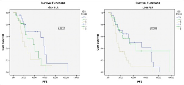 Results: Applying cutoff of 1.9 (NLR), 120.00 (PLR), and 0.27 (MLR), decreased PLR showed a negative impact on the outcome. Decreased PLR is an independent predictor for PFS and OS. There were no significant differences in median survival between the high and low NLR (P = 0.80) and MLR (P = 0.87) groups.