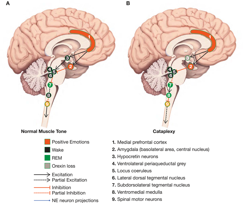 Keywords: Amygdala; Autoimmune; Cataplexy; Excessive daytime sleepiness; Hypocretin; Locus coeruleus; Mechanism of action; Narcolepsy; Norepinephrine; Orexin.
