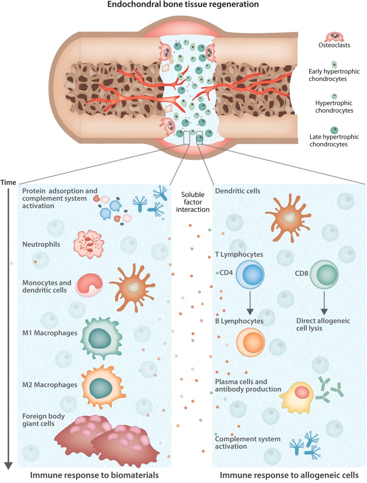 Tissue engineered cartilage substitutes, which induce the process of endochondral ossification, represent a regenerative strategy for bone defect healing. Such constructs typically consist of multipotent mesenchymal stromal cells (MSCs) forming a cartilage template in vitro, which can be implanted to stimulate bone formation in vivo. The use of MSCs of allogeneic origin could potentially improve the clinical utility of the tissue engineered cartilage constructs in three ways. First, ready-to-use construct availability can speed up the treatment process. Second, MSCs derived and expanded from a single donor could be applied to treat several patients and thus the costs of the medical interventions would decrease. Finally, it would allow more control over the quality of the MSC chondrogenic differentiation. However, even though the envisaged clinical use of allogeneic cell sources for bone regeneration is advantageous, their immunogenicity poses a significant obstacle to their clinical application. The aim of this review is to increase the awareness of the role played by immune cells during endochondral ossification, and in particular during regenerative strategies when the immune response is altered by the presence of implanted biomaterials and/or cells. More specifically, we focus on how this balance between immune response and bone regeneration is affected by the implantation of a cartilaginous tissue engineered construct of allogeneic origin.