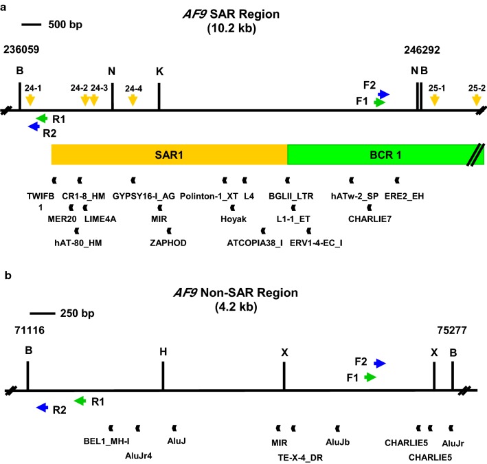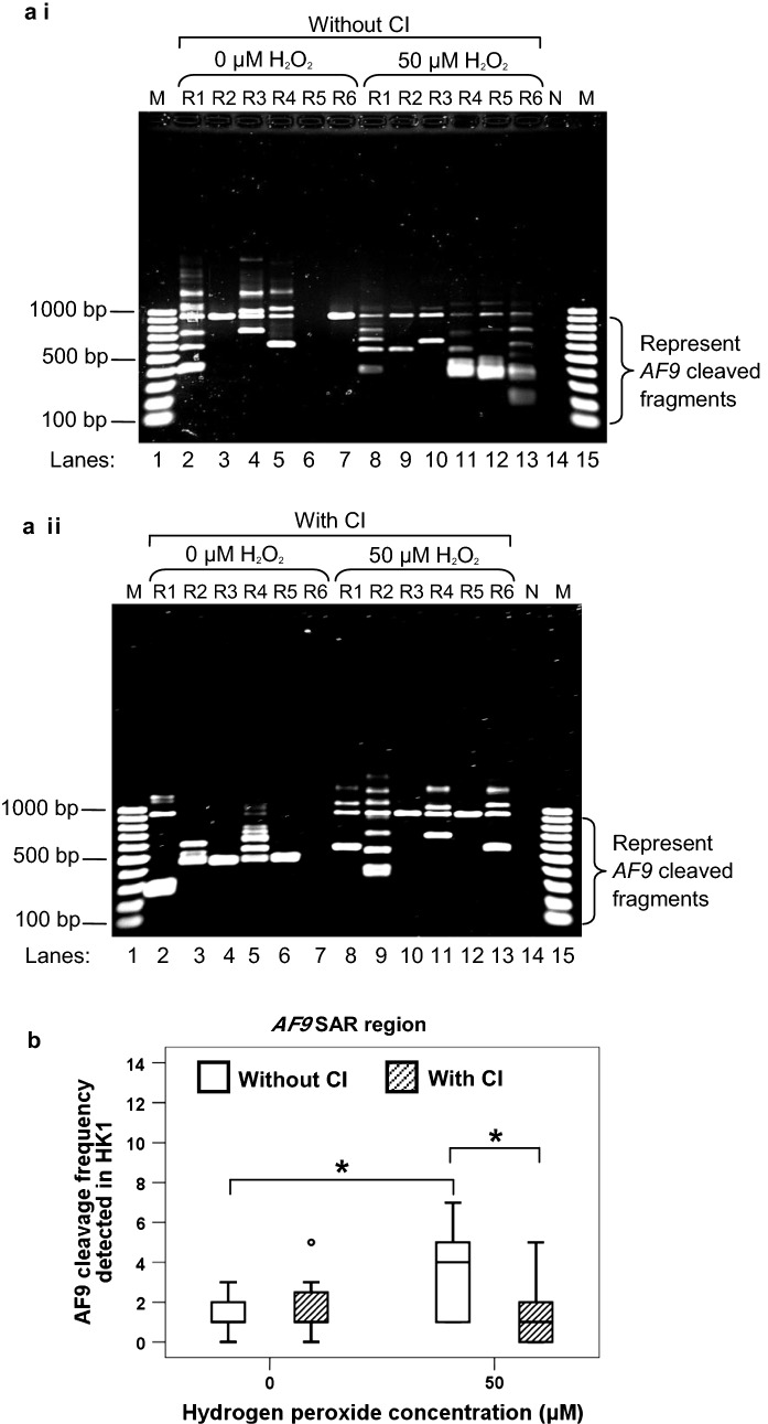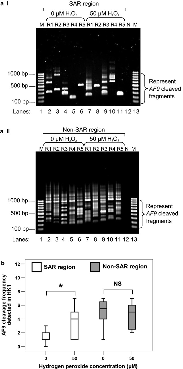 Results: By using MAR/SAR recognition signature (MRS), potential MAR/SAR sites were predicted in the AF9 gene. The predicted MAR/SAR sites precisely match to the experimentally determined MAR/SARs. Hydrogen peroxide (H2O2) was used to induce apoptosis in normal nasopharyngeal epithelial cells (NP69) and NPC cells (HK1). Nested inverse polymerase chain reaction was employed to identify the AF9 gene cleavages. In the SAR region, the gene cleavage frequency of H2O2-treated cells was significantly higher than that of the non-treated cells. A few chromosomal breakages were detected within the AF9 region which was previously found to be involved in the mixed lineage leukaemia (MLL)-AF9 translocation in an acute lymphoblastic leukaemia patient. As for the non-SAR region, no significant difference in the gene cleavage frequency was found between the untreated control and H2O2-treated cells. Furthermore, H2O2-induced cleavages within the SAR region were reduced by caspase-3 inhibitor, which indirectly inhibits CAD.