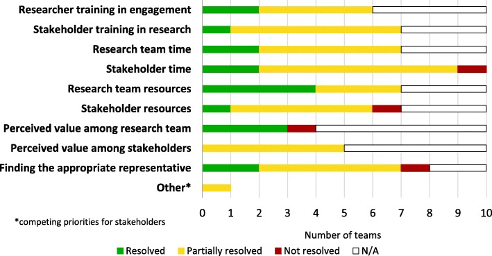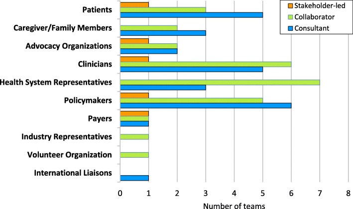 Plain english summary: Increasingly, health researchers are conducting their research in partnership with non-researchers such as patients and caregivers, advocacy groups, clinicians, and policymakers. The idea behind this partnership is to make research more relevant and appropriate. However, so far there is not much evidence about how this partnership or engagement actually affects research. We conducted an online survey of 12 teams in Canada that have engaged patients and other stakeholders in community based health research, partly as a requirement to obtain funding. We found that in many cases, the teams have engaged a wide variety and large number of stakeholders, and have involved them in many different stages of their research. Teams reported that their overall experience of this approach to research has been positive, but some challenges have been encountered along the way. Some teams found that it was difficult to communicate appropriately with all the stakeholders, and to keep them informed when research was going slowly. Other teams had trouble finding government representatives to work with. Several teams noted that engagement is time-consuming, and requires a lot of effort. Nevertheless, all teams reported that they had learned from the experience, and found it valuable. As a result, Canadian health care researchers are better positioned to engage with patients and other stakeholders in the future.