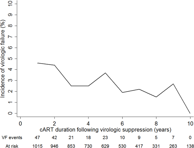 Methods: From 2005 to 2014, patients younger than 20 years who achieved virologic suppression and had subsequent viral load testing were included. Early virologic failure was defined as a HIV RNA ≥1000 copies per milliliter within 12 months of virologic suppression, and late virologic as a HIV RNA ≥1000 copies per milliliter after 12 months following virologic suppression. Characteristics at combination antiretroviral therapy initiation and virologic suppression were described, and a competing risk time-to-event analysis was used to determine cumulative incidence of virologic failure and factors at virologic suppression associated with early and late virologic failure.