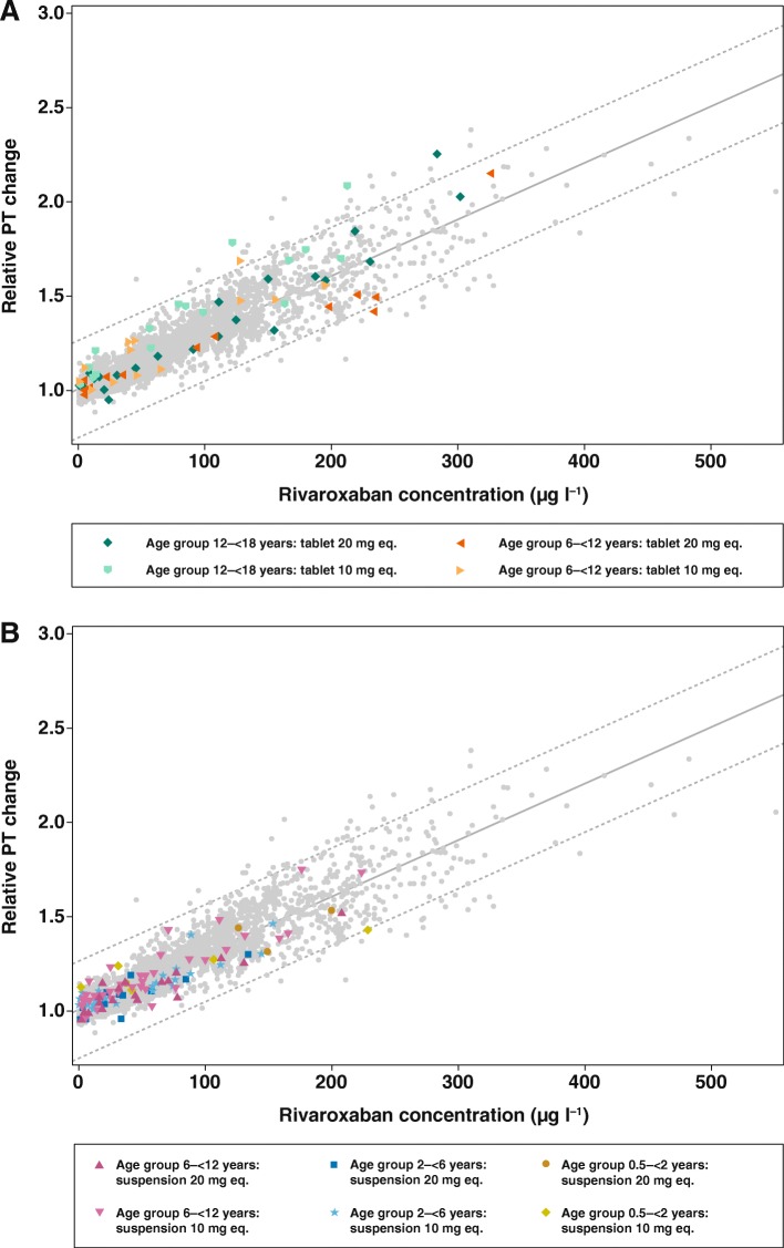 Results: Fifty-nine children were evaluated. In all age groups, PD parameters (prothrombin time, activated partial thromboplastin time and anti-Factor Xa activity) showed a linear relationship versus rivaroxaban plasma concentrations and were in line with previously acquired adult data, as well as in vitro spiking experiments. The rivaroxaban pediatric physiologically based pharmacokinetic model, used to predict the doses for the individual body weight groups, was confirmed. No episodes of bleeding were reported, and treatment-emergent adverse events occurred in four children and all resolved during the study.