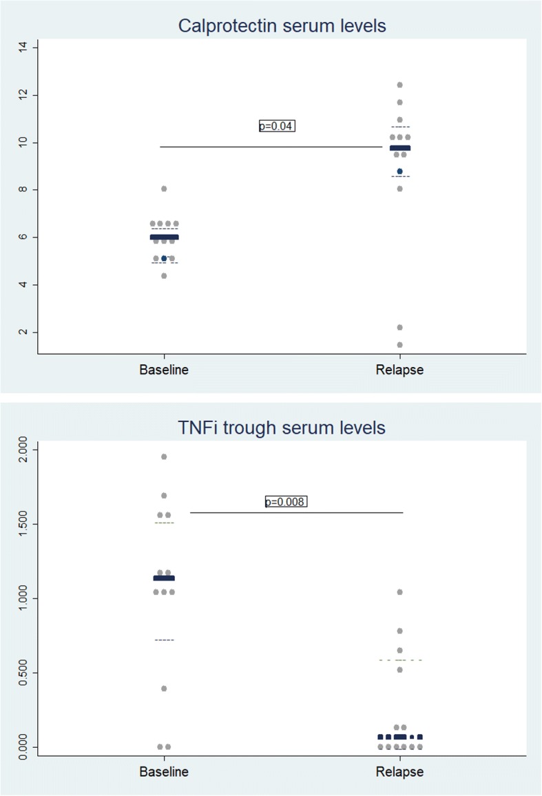 Conclusion: Time-to-remission/low disease activity, calprotectin serum levels, TNFi TSL, and PD score were significantly associated with disease relapse. However, only baseline calprotectin serum levels independently predicted disease relapse in RA and PsA patients under TNFi therapy.