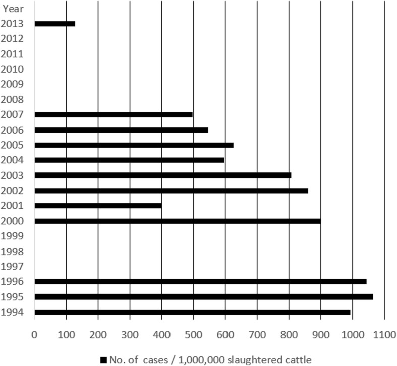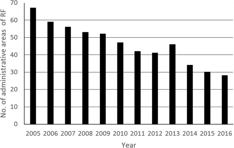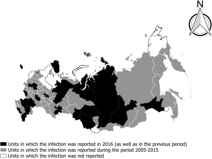 Results: From the 404 records returned by our search strategy, we identified 17 official county reports, 17 papers and one meeting abstract on the occurrence of taeniosis or cysticercosis from the Russian Federation, eligible for inclusion in this study. In the Russian Federation, Taenia saginata infection has been continuously present and notifiable in the study period between 1991-2016. In the same area, a continuous decrease in the incidence of human taeniosis cases was observed, from 1.4 to 0.04 cases per 100,000 inhabitants, as well as a reduction in the territory where the infection is reported. The prevalence of bovine cysticercosis, ranging between 0.1-19.0%, generally has a declining trend, especially after 2005.
