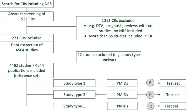 Methods: Our analysis is a retrospective analysis of study filters based on MEDLINE citations of NRS from Cochrane reviews. In a first step we identified existing NRS filters. For the generation of the reference set, we screened Cochrane reviews evaluating NRS, which covered a broad range of study types. The citations of the studies included in the Cochrane reviews were identified via the reviews' bibliographies and the corresponding PubMed identification numbers (PMIDs) were extracted from PubMed. Random samples comprising up to 200 citations (i.e. 200 PMIDs) each were created for each study type to generate the test sets.