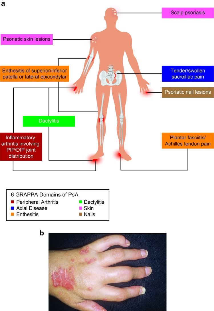 Psoriatic arthritis (PsA) is a clinically heterogeneous form of progressive inflammatory arthritis that affects up to 30% of patients with psoriasis. The rapid rate of progression associated with PsA makes early-disease diagnosis and treatment crucial to patients' quality of life and long-term health. With the aim of providing clinical guidance to physician assistants and nurse practitioners, this article gives an overview of the different PsA clinical domains, including peripheral arthritis, axial disease, enthesitis, dactylitis, skin disease, and nail dystrophy, which should be considered as part of diagnosis and treatment strategies. The efficacy of different therapies across these PsA domains is reviewed within the context of current PsA treatment guidelines while considering more recent data on newly approved therapies for PsA.Funding: Novartis Pharmaceuticals Corp., East Hanover, NJ, USA.