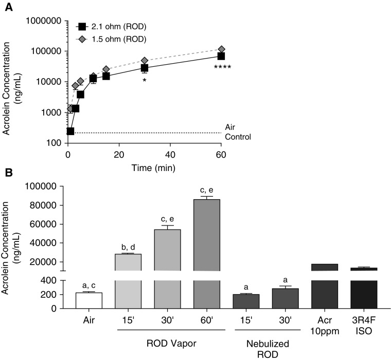 Cigarette smoking is associated with chronic obstructive pulmonary disease and chronic bronchitis. Acquired ion transport abnormalities, including cystic fibrosis transmembrane conductance regulator (CFTR) dysfunction, caused by cigarette smoking have been proposed as potential mechanisms for mucus obstruction in chronic bronchitis. Although e-cigarette use is popular and perceived to be safe, whether it harms the airways via mechanisms altering ion transport remains unclear. In the present study, we sought to determine if e-cigarette vapor, like cigarette smoke, has the potential to induce acquired CFTR dysfunction, and to what degree. Electrophysiological methods demonstrated reduced chloride transport caused by vaporized e-cigarette liquid or vegetable glycerin at various exposures (30 min, 57.2% and 14.4% respectively, vs. control; P < 0.0001), but not by unvaporized liquid (60 min, 17.6% vs. untreated), indicating that thermal degradation of these products is required to induce the observed defects. We also observed reduced ATP-dependent responses (-10.8 ± 3.0 vs. -18.8 ± 5.1 μA/cm2 control) and epithelial sodium channel activity (95.8% reduction) in primary human bronchial epithelial cells after 5 minutes, suggesting that exposures dramatically inhibit epithelial ion transport beyond CFTR, even without diminished transepithelial resistance or cytotoxicity. Vaporizing e-cigarette liquid produced reactive aldehydes, including acrolein (shown to induce acquired CFTR dysfunction), as quantified by mass spectrometry, demonstrating that respiratory toxicants in cigarette smoke can also be found in e-cigarette vapor (30 min air, 224.5 ± 15.99; unvaporized liquid, 284.8 ± 35.03; vapor, 54,468 ± 3,908 ng/ml; P < 0.0001). E-cigarettes can induce ion channel dysfunction in airway epithelial cells, partly through acrolein production. These findings indicate a heretofore unknown toxicity of e-cigarette use known to be associated with chronic bronchitis onset and progression, as well as with chronic obstructive pulmonary disease severity.