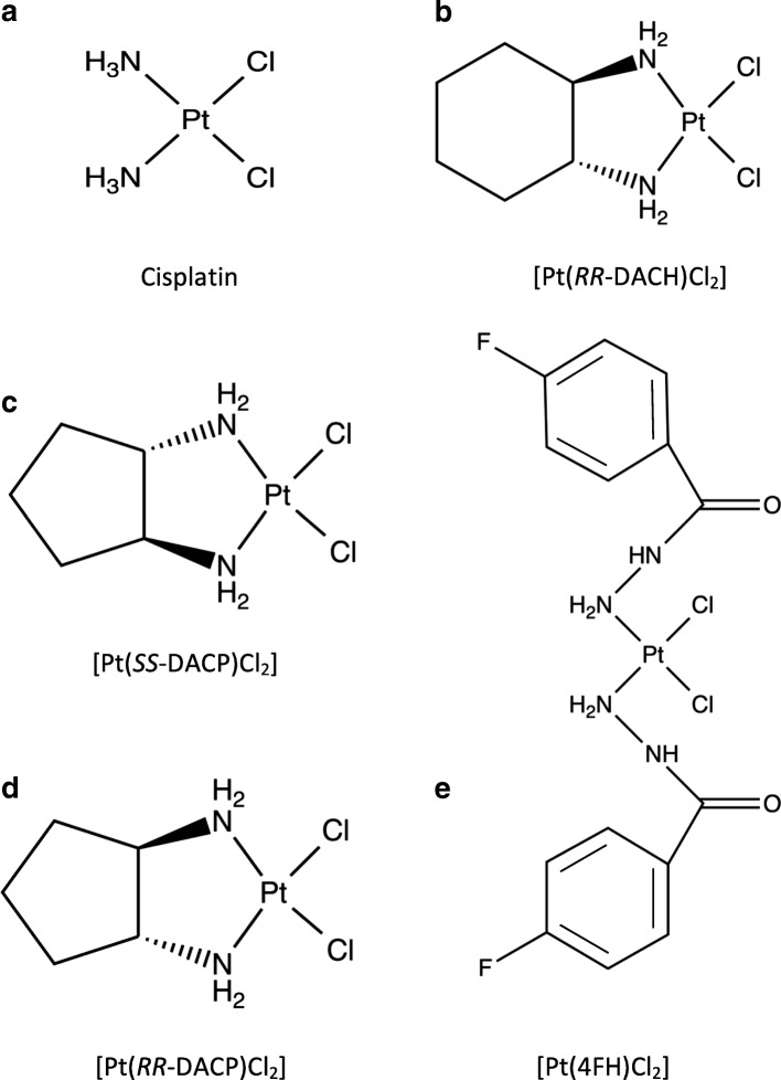 Background: Cisplatin has been widely used for the treatment of cancer and its antitumour activity is attributed to its capacity to form DNA adducts, predominantly at guanine residues, which impede cellular processes such as DNA replication and transcription. However, there are associated toxicity and drug resistance issues which plague its use. This has prompted the development and screening of a range of chemotherapeutic drug analogues towards improved efficacy. The biological properties of three novel platinum-based compounds consisting of varying cis-configured ligand groups, as well as a commercially supplied compound, were characterised in this study to determine their potential as anticancer agents.