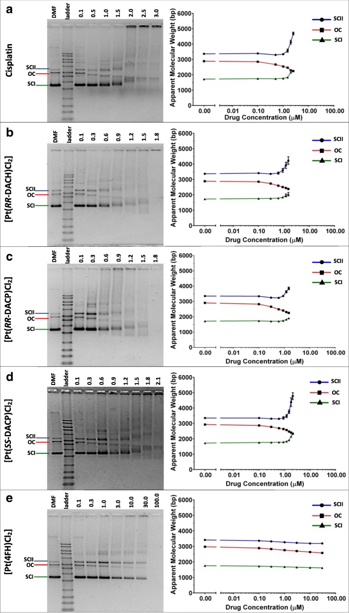 Conclusions: The biological characteristics of these compounds were assessed relative to cisplatin, and a variation in the sequence specificity and a greater capacity to induce DNA unwinding was observed. These compounds warrant further investigations towards developing more efficient chemotherapeutic drugs.