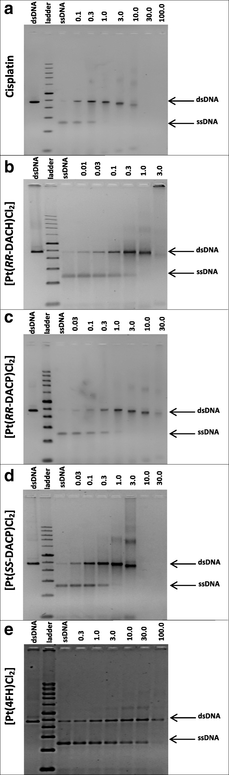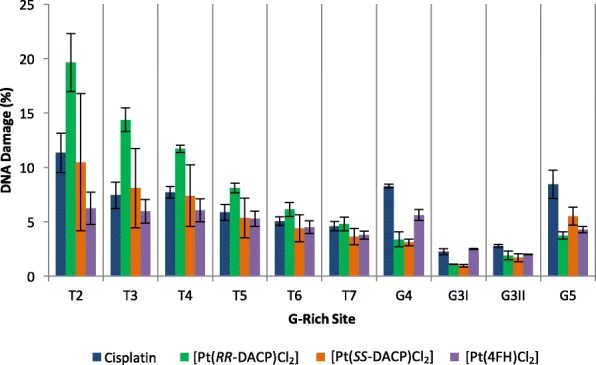 Results: All three novel platinum-based compounds were found to induce DNA adduct formation at the tandem telomeric repeat sequences. The sequence specificity profile at these sites was characterised and these were distinct from that of cisplatin. Two of these compounds with the enantiomeric 1,2-diaminocyclopentane ligand (SS and RR-DACP) were found to induce a greater degree of DNA unwinding than cisplatin, but exhibited marginally lower DNA cross-linking efficiencies. Furthermore, the RR-isomer was more cytotoxic in HeLa cells than cisplatin.