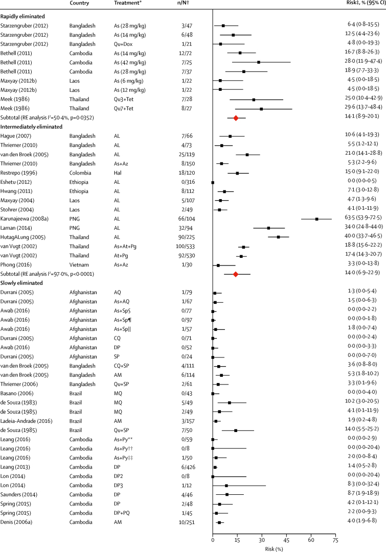Findings: 153 of 891 screened studies were included in the analysis, including 31 262 patients from 323 site-specific treatment groups: 130 (85%) studies were from the Asia-Pacific region, 16 (10%) from the Americas, and seven (5%) from Africa. The risk of P vivax parasitaemia by day 42 was 5·6% (95% CI 4·0-7·4; I2=92·0%; 117 estimates). The risk of P vivax parasitaemia was 6·5% (95% CI 4·6-8·6) in regions of short relapse periodicity compared with 1·9% (0·4-4·0) in regions of long periodicity, and was greater after treatment with a more rapidly eliminated ACT: 15·3% (5·1-29·3) for artemether-lumefantrine compared with 4·5% (1·2-9·3) for dihydroartemisinin-piperaquine and 5·2% (2·9-7·9) for artesunate-mefloquine. Recurrent parasitaemia was delayed in patients treated with ACTs containing mefloquine or piperaquine compared with artemether-lumefantrine, but by day 63 the risk of vivax parasitaemia was more than 15% for all ACTs assessed.
