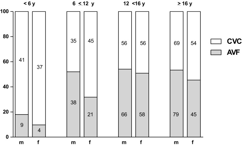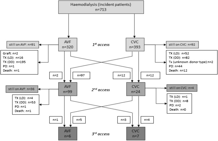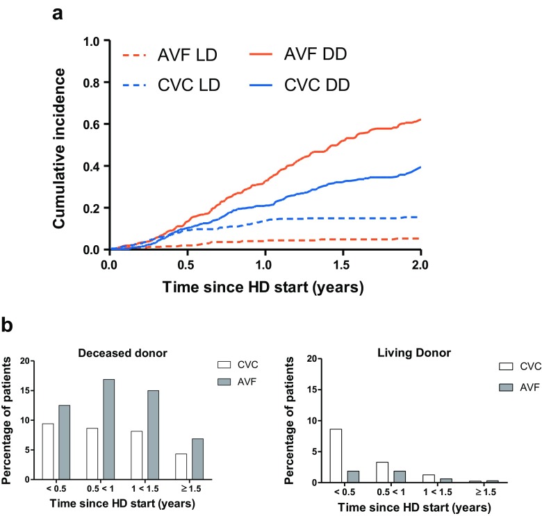 Results: Three hundred ninety-three (55.1%) of 713 children started HD with a CVC and were more often females, younger, had more often an unknown diagnosis, glomerulonephritis, or vasculitis, and lower hemoglobin and height-SDS at HD initiation. AVF patients were 91% less likely to switch to a second access, and two-year patient survival was 99.6% (CVC, 97.2%). Children who started with an AVF were less likely to receive a living donor transplant (adjusted HR, 0.30; 95% CI, 0.16-0.54) and more likely to receive a deceased donor transplant (adjusted HR, 1.50; 95% CI, 1.17-1.93), even after excluding patients who died or were transplanted in the first 6 months.