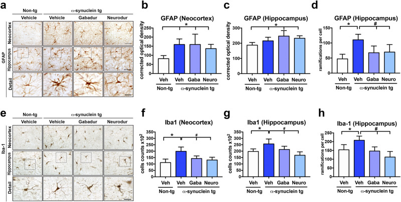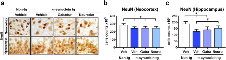 Parkinson's disease (PD) and dementia with Lewy bodies (DLB) are neurodegenerative disorders of the aging population characterized by the accumulation of α-synuclein (α-syn). The mechanisms triggering α-syn toxicity are not completely understood, however, c-terminus truncation of α-syn by proteases such as calpain may have a role. Therefore, inhibition of calpain may be of value. The main objective of this study was to evaluate the effects of systemically administered novel low molecular weight calpain inhibitors on α-syn pathology in a transgenic mouse model. For this purpose, non-tg and α-syn tg mice received the calpain inhibitors - Gabadur, Neurodur or a vehicle, twice a day for 30 days. Immunocytochemical analysis showed a 60% reduction in α-syn deposition using Gabadur and a 40% reduction using Neurodur with a concomitant reduction in c-terminus α-syn and improvements in neurodegeneration. Western blot analysis showed a 77% decrease in α-spectrin breakdown products (SBDPs) SBDPs with Gabadur and 63% reduction using Neurodur. There was a 65% reduction in the active calpain form with Gabadur and a 45% reduction with Neurodur. Moreover, treatment with calpain inhibitors improved activity performance of the α-syn tg mice. Taken together, this study suggests that calpain inhibition might be considered in the treatment of synucleinopathies.