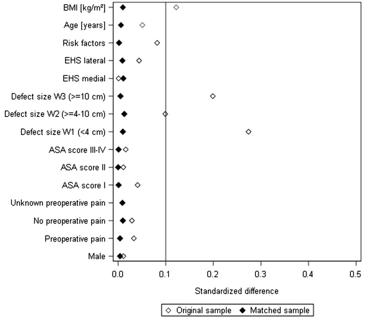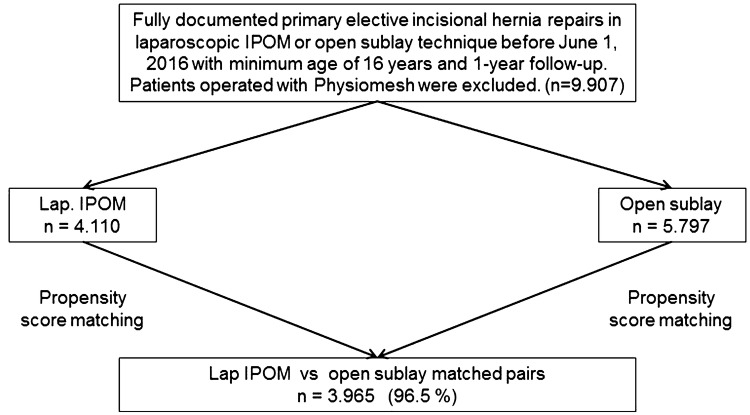 Methods: In total, 9907 patients with an elective incisional hernia repair and 1-year follow-up were selected from the Herniamed Hernia Registry between September 1, 2009 and June 1, 2016. Using propensity score matching, 3965 (96.5%) matched pairs from 4110 laparoscopic IPOM and 5797 sublay operations were formed for comparison of the techniques.