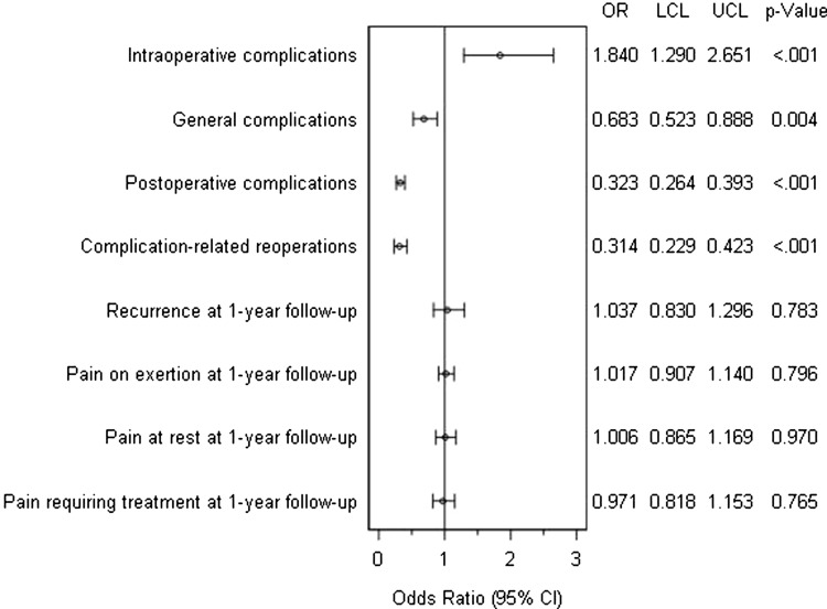 Conclusion: Laparoscopic IPOM was found to have advantages over the open sublay technique regarding the rates of both surgical and general postoperative complications as well as complication-related reoperations, but disadvantages regarding the rate of intraoperative complications.