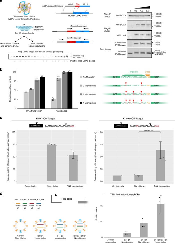 P.E.M., T.O., and E.P.R. are named as inventors on a patent relating to the Nanoblades technology (patent applicants: Institut National de la Sante et de la Recherche Medicale (INSERM), Centre National de la Recherche Scientifique (CNRS), Ecole Normale Superieure de Lyon, Universite Claude Bernard Lyon 1, Villeurb-Anne Cedex; name of inventors: Theophile Ohlmann, Mathieu Misery, Philippe Mangeot, Emiliano Ricci; application number: WO 2017/068077 Al; patent status: published, 27th April 2017; all aspects of the manuscript are covered by the patent application. The remaining authors declare no competing interests.
