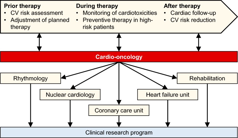 Cancer and cardiovascular diseases are the main causes for morbidity and mortality in modern society. In the United States of America (USA), over 1.7 million new cancer cases will presumably be observed in 2018. Progress in cancer treatment has greatly improved survival and it is estimated that 15.5 million cancer survivors currently live in the USA. The number of cancer survivors is expected to increase by 68% until 2040. Moreover, the portion of cancer survivors at the age of 65 years or older will increase from 62% to approximately 73% in 2040 which in turn enhances comorbidities in cancer survivors. Increased survival and age of cancer patients has unmasked the burden of cancer and cancer therapy-associated cardiovascular diseases. Depending on cancer treatment modalities, early cardiovascular toxicity is observed in up to 48% of patients. Late cardiotoxicity can be found in 30% of patients at 13 years after cancer treatment. Cardio-oncology aims to identify cancer therapy-related cardiovascular side effects and to provide optimum multidisciplinary care for cancer patients. So far, scientific effort has generated a profound knowledge on underlying pathomechanisms and clinical implications but standardized recommendations and structural requirements for cardio-oncology care are still limited.
