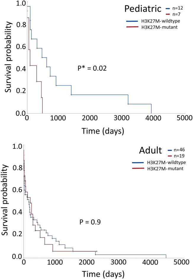 Conclusion: H3 K27M mutations are frequent in adult midline gliomas and have a prognostic role similar to H3 K27M wild-type high-grade tumors.