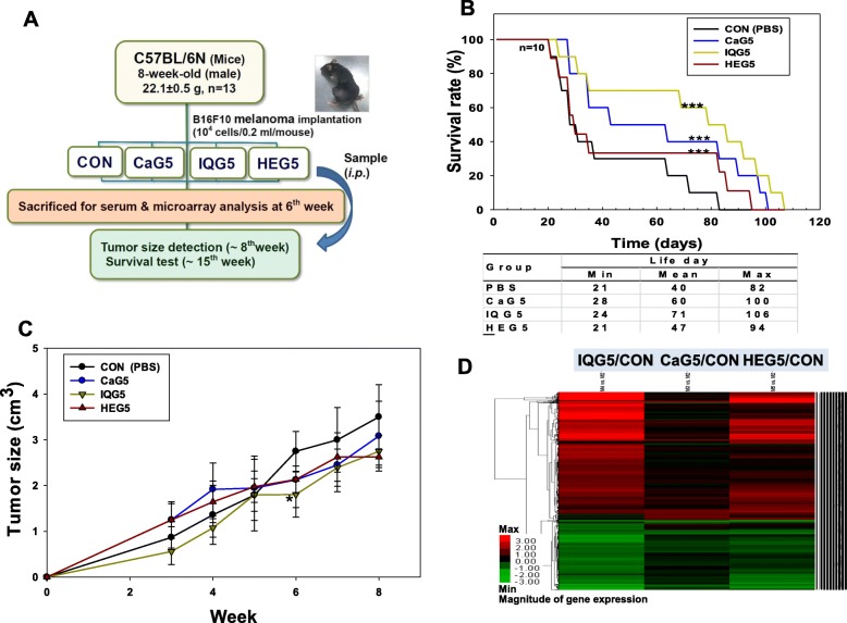 Methods: To determine molecular mechanism involved in the anti-cancer effect of dung beetle GAG, its origin N-glycan under 3KD Dalton was assayed for melanoma cell cytotoxicity. Quantitative comparisons of adhesive molecule on extracellular matrix and activities of tissue inhibitor of metalloprotease 2 (TIMP-2) were also investigated. In vivo anti-cancer effect of dung beetle GAG on solid tumor size, survival time and gene-expression profiles was also assayed using B10F10 melanoma mice model. Mice with induced melanoma were then treated with Catharsius molossus (dung beetle) GAG (CaG) at 5 mg/kg for 8 weeks to investigate its anti-cancer effects compared to bumblebee (Bombus ignitus) queen glycosaminoglycan (IQG) and Huechys sanguinea glycosaminoglycan (HEG).