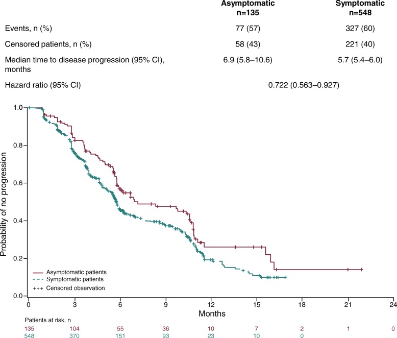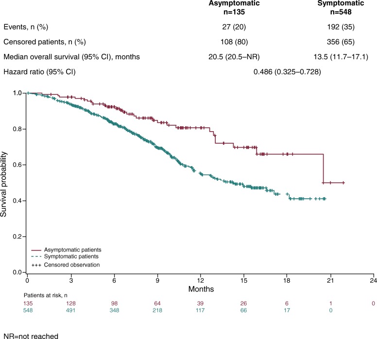Results: Seven hundred eight patients received ≥1 radium-223 injection: 548 (77%) were symptomatic to various degrees, and 135 (19%) were asymptomatic. Asymptomatic patients had more favorable baseline disease characteristics than symptomatic. A lower proportion of asymptomatic versus symptomatic patients had received prior abiraterone (25% vs 35%) and prior docetaxel (52% vs 62%). A higher proportion of asymptomatic (71%) versus symptomatic (55%) patients completed radium-223 treatment. Overall survival (hazard ratio [HR] 0.486), time to disease progression (HR 0.722) and time to first symptomatic skeletal event (HR 0.328) were better in asymptomatic than symptomatic patients. Alkaline phosphatase (ALP) response rates were similar (46% vs 47%), and ALP normalization (44% vs 25%) and prostate-specific antigen response rates (21% vs 13%) were higher in asymptomatic than symptomatic patients. A lower proportion of asymptomatic patients reported treatment-emergent adverse events (TEAEs, 61% vs 79%), grade 3-4 TEAEs (29% vs 40%) and drug-related TEAEs (28% vs 44%). There were two treatment-related deaths, both in patients with baseline symptomatic disease.