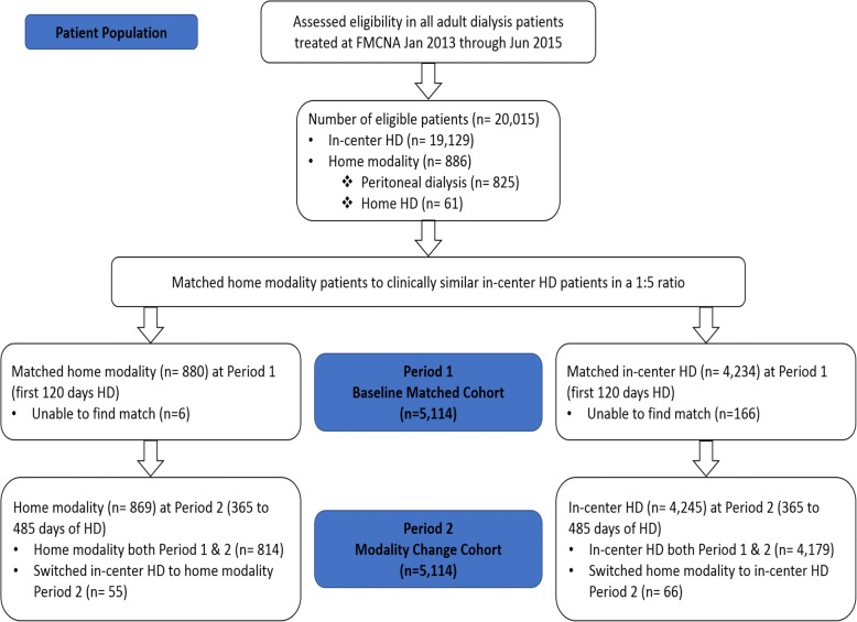 Methods: National retrospective cohort study of adult patients who initiated in-center dialysis or a home modality (peritoneal or home hemodialysis) between 1/2013 and 6/2015. Patients remained on the same modality for the first 120 days of the first two years. HrQoL was assessed by the Kidney Disease and Quality of Life-36 (KDQOL) survey in the first 120 days of the first two years after dialysis initiation. Home modality patients were matched to in-center patients in a 1:5 fashion.