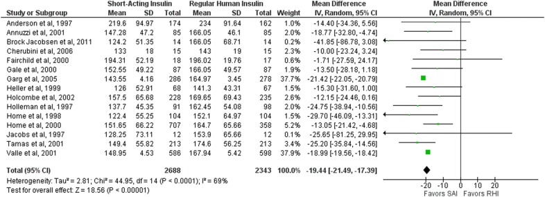 Results: Of the 2897 articles retrieved, 22 (6235 patients) were included. Short-acting insulin analogues were associated with a decrease in total hypoglycemic episodes (risk rate 0.93, 95% CI 0.87-0.99; 6235 patients; I2 = 81%), nocturnal hypoglycemia (risk rate 0.55, 95% CI 0.40-0.76, 1995 patients, I2 = 84%), and severe hypoglycemia (risk rate 0.68, 95% CI 0.60-0.77; 5945 patients, I2 = 0%); and with lower postprandial glucose levels (mean difference/MD - 19.44 mg/dL; 95% CI - 21.49 to - 17.39; 5031 patients, I2 = 69%) and lower HbA1c (MD - 0,13%; IC 95% - 0.16 to - 0.10; 5204 patients; I2 = 73%) levels.