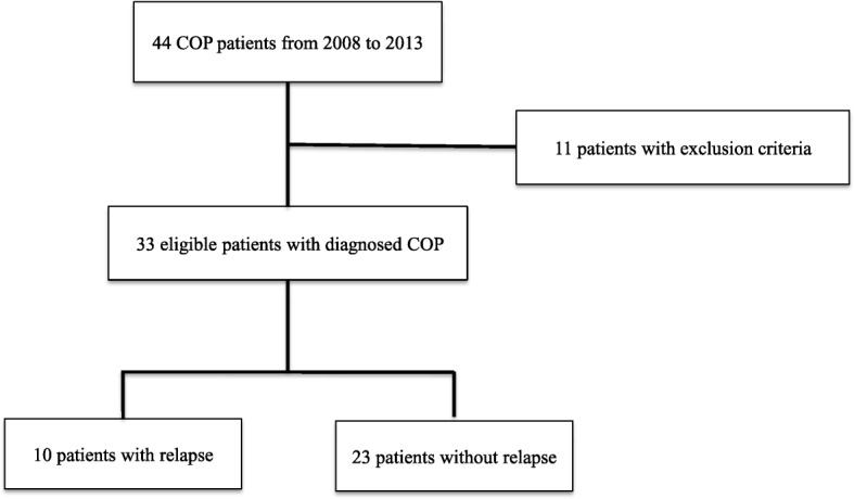 Methods: During 2008-2013, 33 COP patients were treated, of which 23 (69.7%) and 10 patients (30.3%) were assigned to the non-relapse and relapse group, respectively. From medical records, we compared the following variables at initial episode: clinical characteristics, serum parameters, chest CT scan findings, and steroid treatment.