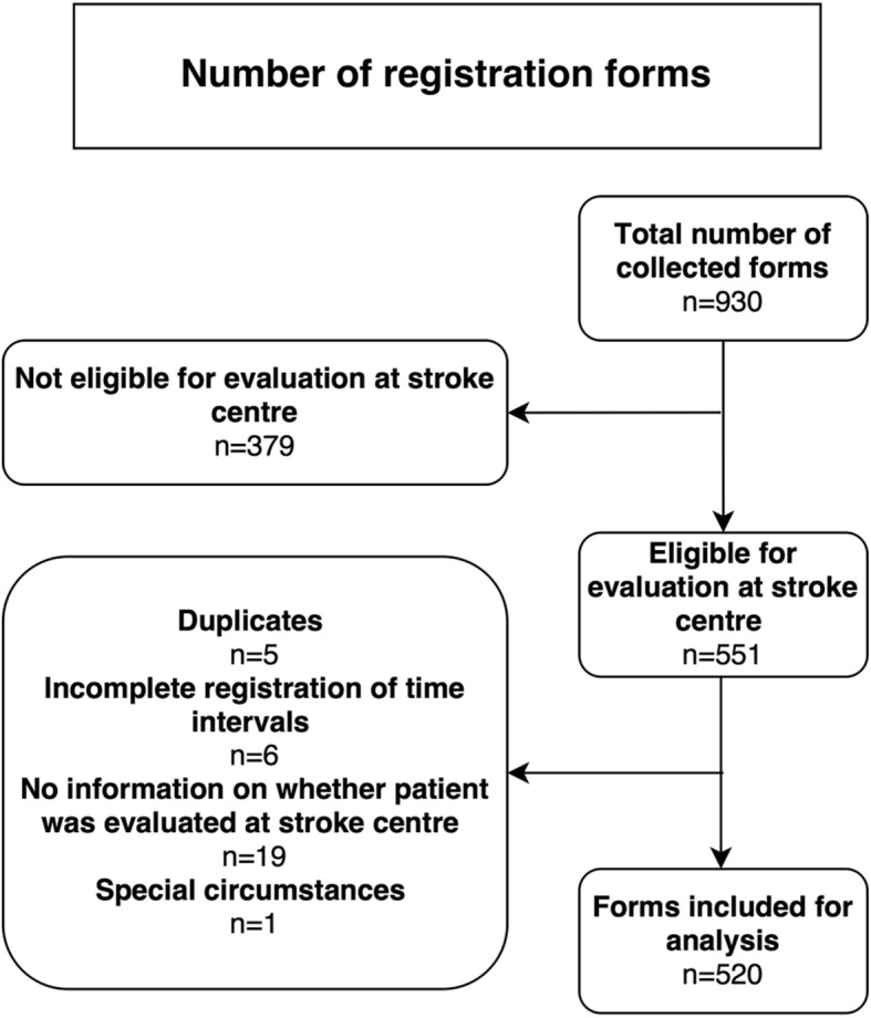 Methods: A study-specific registration form was developed to record detailed information about OST consumption in cases where the Emergency Medical Services (EMS) suspected a stroke from July 2014-May 2015. Registration forms were completed by ambulance personnel and included details on estimated time spent: 1) localising patient, 2) clinical examination, 3) consulting with the on-call neurologist, 4) mobilising patient to the ambulance, 5) treatment in ambulance before departure. Additionally, estimated total OST was noted. For patients found eligible for further evaluation at a stroke centre, time points were analysed using multivariate Poisson regressions.