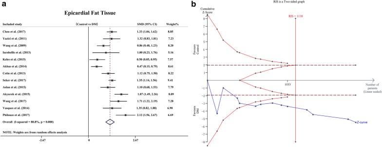 Results: A total of 13 studies (n = 1102 patients) were included in the final analysis. Compared with the control group, DM patients had significantly higher EFT (SMD: 1.23; 95% CI 0.98, 1.48; P = 0.000; TSA-adjusted 95% CI 0.91, 2.13; P < 0.0001). The TSA indicated that the available samples were sufficient and confirmed that firm evidence was reached. According to the regression analysis and subgroup analyses, DM typing, EFT ultrasound measurements, total cholesterol (TC) and triglyceride (TG) levels were confounding factors that significantly affected our results.